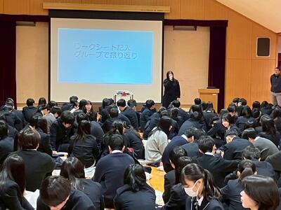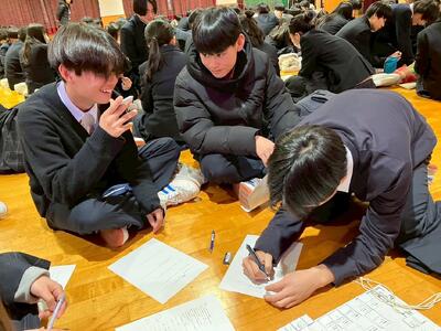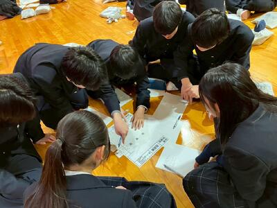 各クラス5グループに分かれて、避難所運営の疑似体験をする「HUG」という、静岡県が開発したゲームをおこないました。次々とやってくる避難者、それぞれに様々な事情を抱えています。また余震がおこったり、物資が到着しても限りがあったり、、、。刻一刻と状況が変わっていく中で最善を相談して決めていく。どのグループも真剣に取り組んでいました。生徒の感想には「災害時は自分のことで精一杯な中で周囲の状況を判断しないといけないのはとても難しいと感じた」「すべての避難者がなるべく快適に過ごせるようにするためにはどうしたら良いか考えることができた」など、多くの気づきがあったようです。