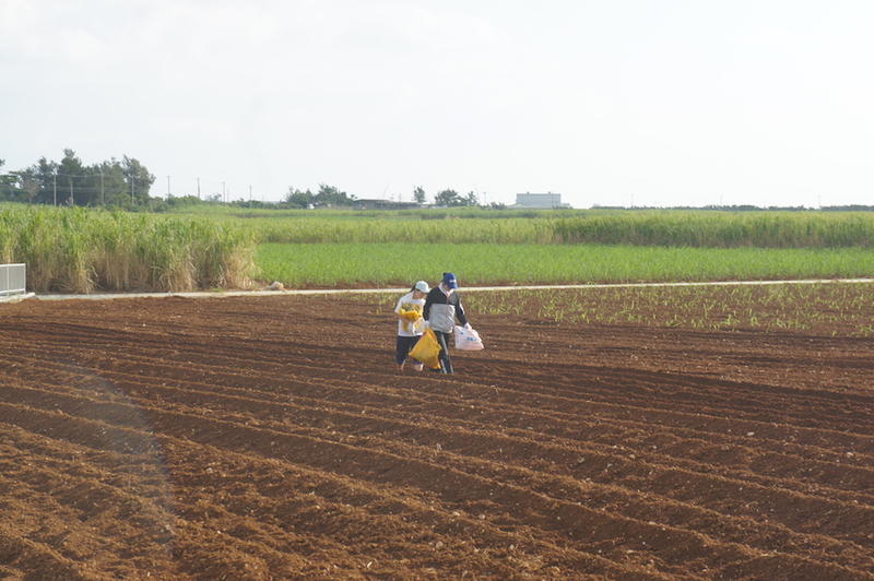 サトウキビ畑で手伝う72回生たち。