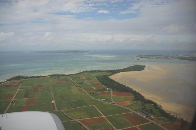 飛行機からの景色は残念ながら雲が多いですが、曇りでも宮古島は美しいですね。