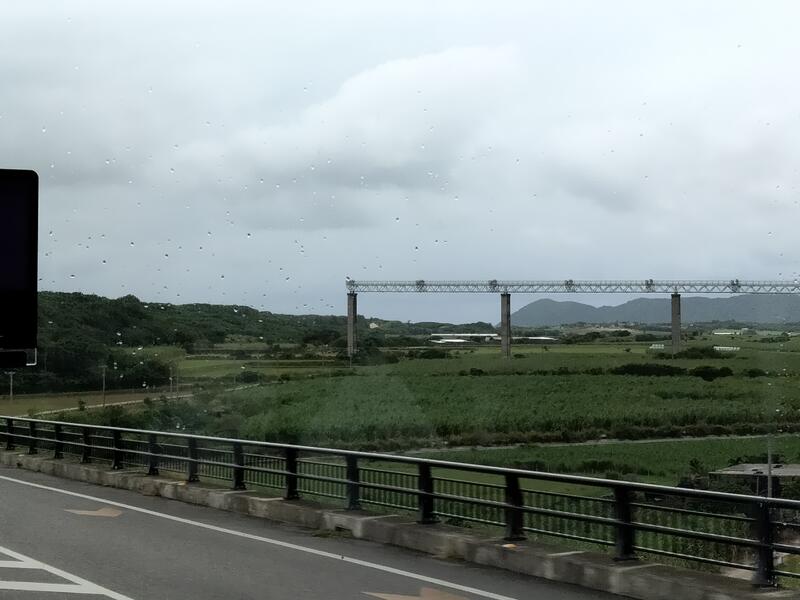 石垣島に着きました。サトウキビ畑に少し雨が降っています。バスでホテルに向かいます。