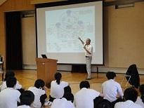 第1学年の生徒を対象に、文理選択に向けての講演会を実施しました。2年次以降の文系・理系のコース選択を今年の2学期に行いますが、それに先だって、大学入学後の研究活動の内容や将来の進路について、大学の担当者から直接お話をうかがう機会を設定しました。