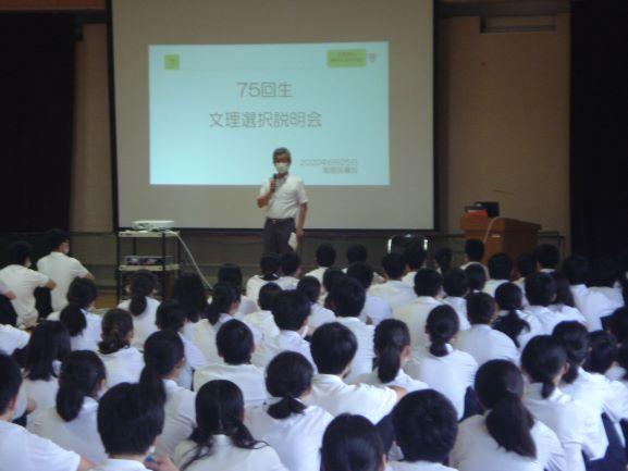 本日は進路指導部長から文理選択を考える際の手順や注意点などの話がありました。75回生の皆さんにとって、自分の将来を決める大事な選択です。周囲のアドバイスも参考にしながら、悔いのないように覚悟をもって選択しましょう。