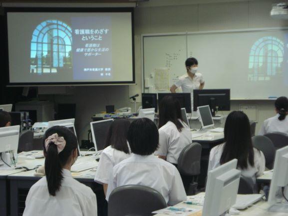 神戸市看護大学から林先生をお招きし、「看護を目指すということ~看護職は健康で豊かな生活のサポーター~」と題してお話をいただきました。内容は、看護職の資格と役割、看護職を目指す心構え、看護職への道、看護職の就職先などでした。コロナ関連の話もしていただきました。貴重なお話を聞くことができ、「理解が深まった」と参加生徒たちにはとても好評でした。林先生、ありがとうございました。