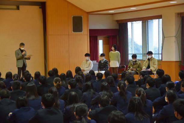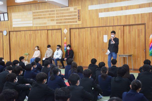 文理に分かれて実施しました。卒業生(74回生)から文理5名ずつの進路決定者が、75回生に向けて受験の話をしてくれました。昨年はコロナで実施できず、74回生にとっては初めての経験でしたが、上手に話をしてくれました。これから本格的に受験生となる75回生にとって大いに参考になる内容で、受験生のイメージがつかめたのではないでしょうか。75回生の皆さん、来年の今頃は逆の立場でこの会に参加しているであろう自分を信じて1年間頑張ってください。74回生の皆さんには、それぞれの進路での益々の活躍を祈ります。