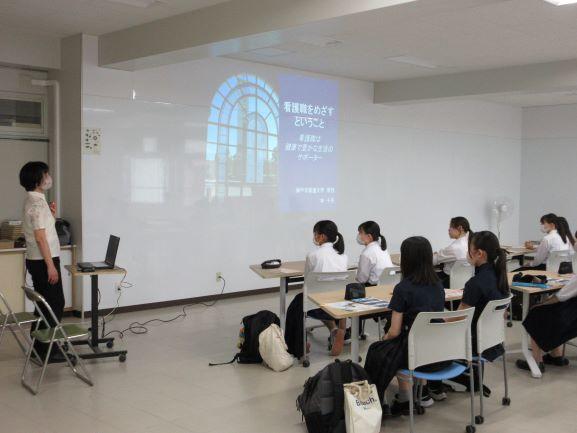 神戸市看護大学の林先生をお招きしました。内容は、看護職の資格と役割、看護職を目指す心構え、看護職への道、看護職の就職先などでした。参加した生徒はメモを取りながら、熱心に聞いていました。看護への理解が深まったことと思います。終盤の「ぜひ、充実した高校生活を送ってください。それが大事。」という言葉に、エネルギーをいただきました。林先生、本日はどうもありがとうございました。